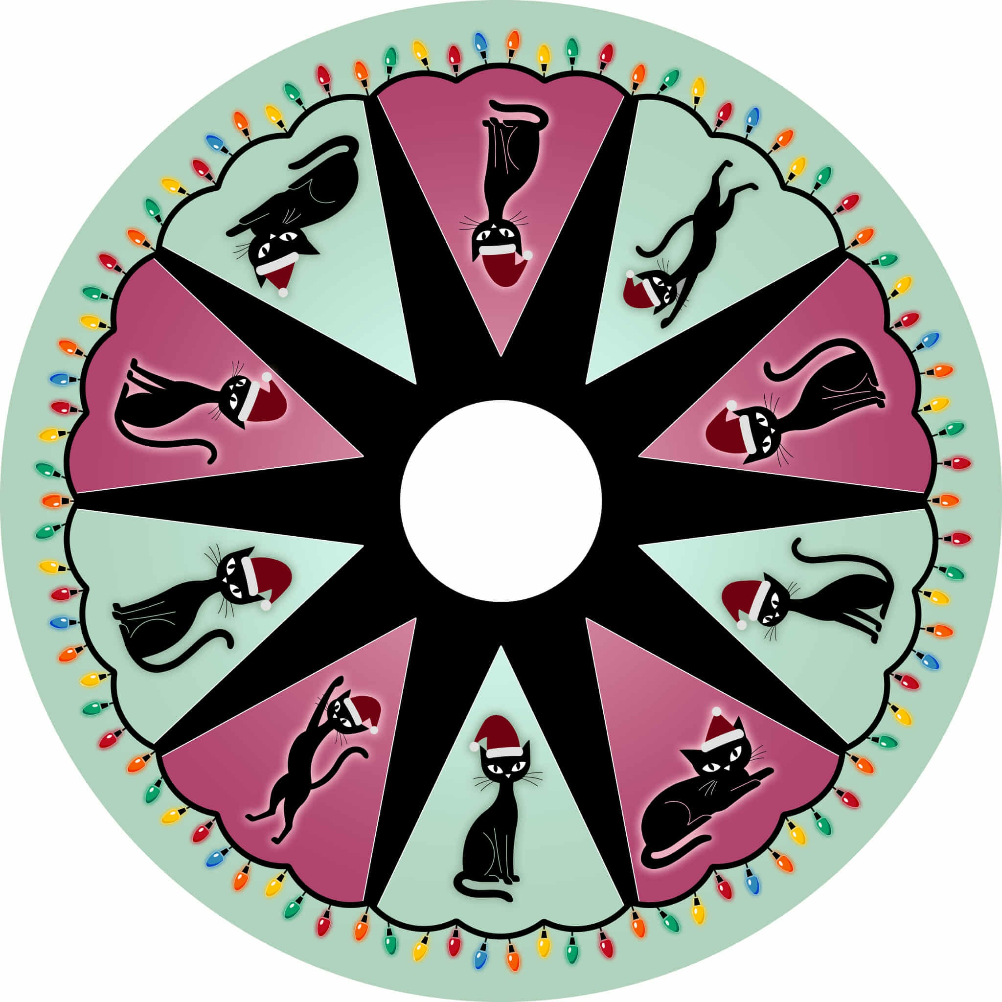 Channel retro holiday glam with a delightfully kitschy twist. Our Atomic Kitty Christmas circle skirt features a full, vintage-inspired silhouette crafted from a soft, flexible yoga-blend fabric for effortless comfort and movement. The standout mid-century atomic print showcases festive black cats in Santa hats framed by bold pink and mint panels, finished with multicolor holiday lights along the hem for extra seasonal charm.
