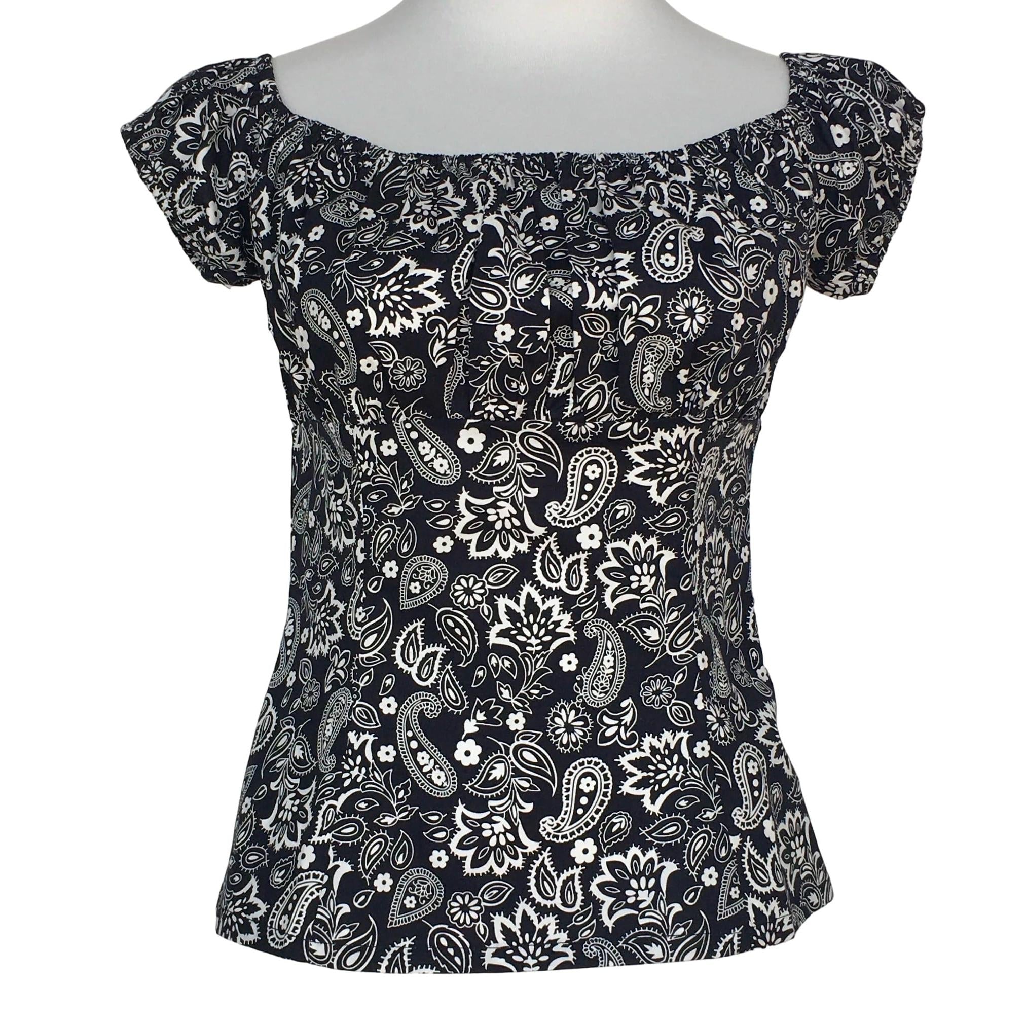 A peasant blouse is a PERFECT addition to any pinup outfit with its simple, classy look. Pair it with your favorite capris, pedal pushers, or circle skirt for a romantic retro look. Pretty paisley kerchief print in black and white.