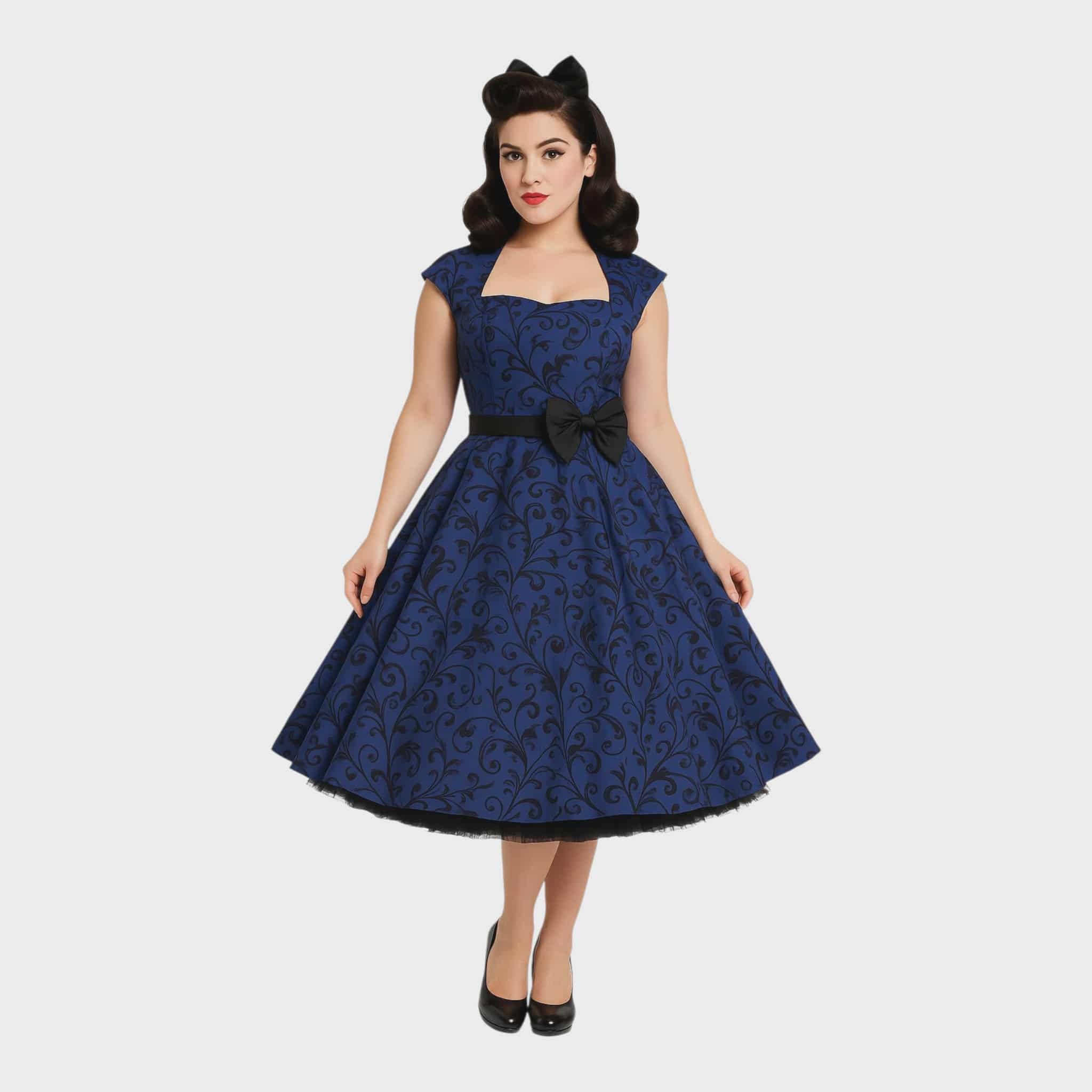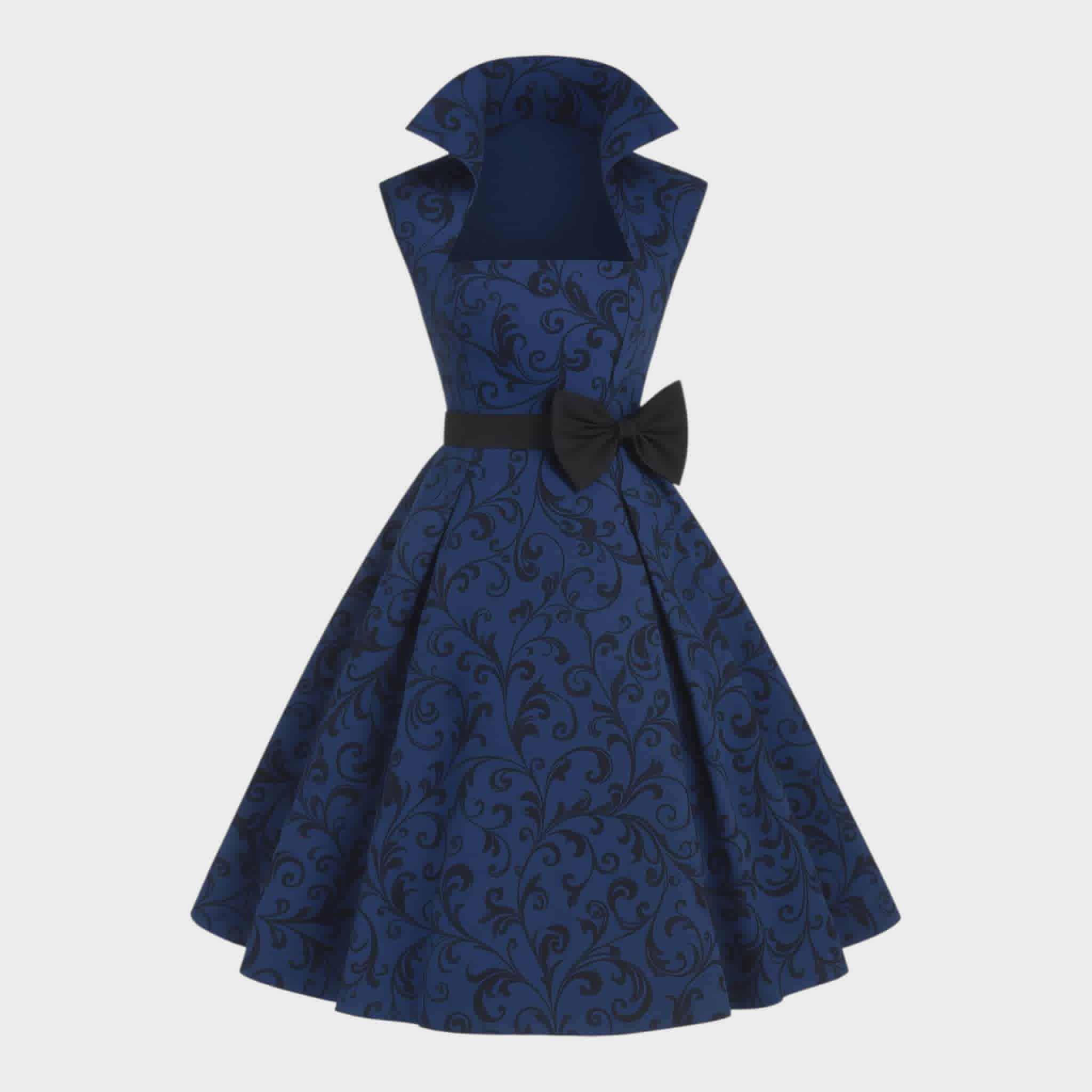 Ā A satin black bow at the waist adds the perfect touch of playful femininity ā true to the rockabilly spirit. Pair it with red lips, victory rolls, and your favorite heels for that timeless pinup look that commands attention from every angle. Details: Rich navy blue with black scroll pattern. Stand-up collar and square neckline. Fitted bodice with wide waistband and bow accent Full swing skirt, perfect for a petticoat Hidden side zip for a smooth fit