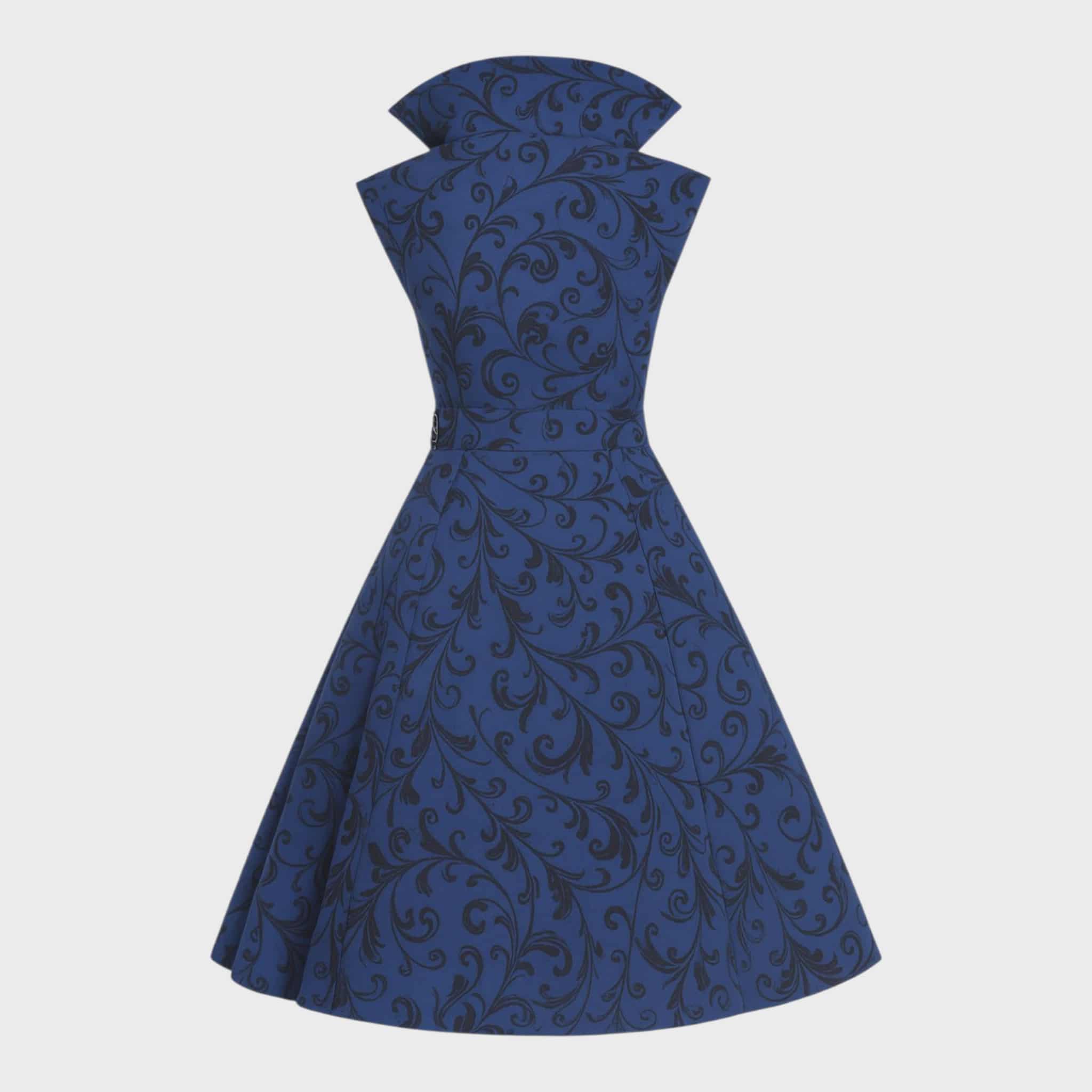 Midnight Swing ā Vintage Rockabilly Dress Turn heads in the Midnight Swing Dress, a showstopping piece inspired by classic 1950s glamour. This deep sapphire-blue beauty features an elegant square neckline framed by a dramatic stand-up collar, creating a bold silhouette that channels old-Hollywood sophistication. Crafted with a swirling black baroque pattern, the fabric captures movement and depth, while the cinched waist and full circle skirt flatter every curve.