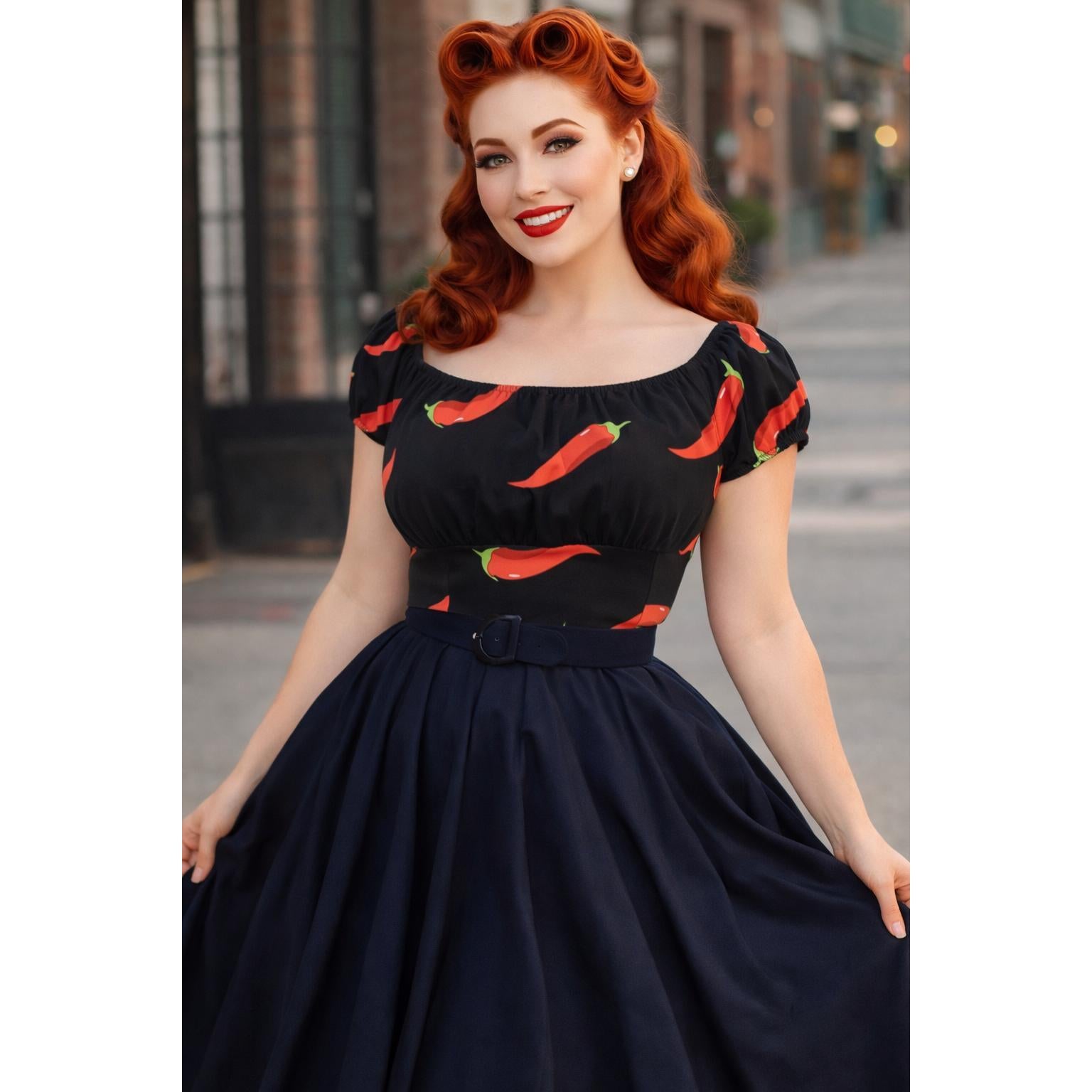 A peasant blouse is the PERFECT addition to any pinup outfit with its simple, classy look. Pair it with your favorite capris, pedal pushers, or circle skirt for a romantic retro look. This chile pepper print one is especially hot cha!!