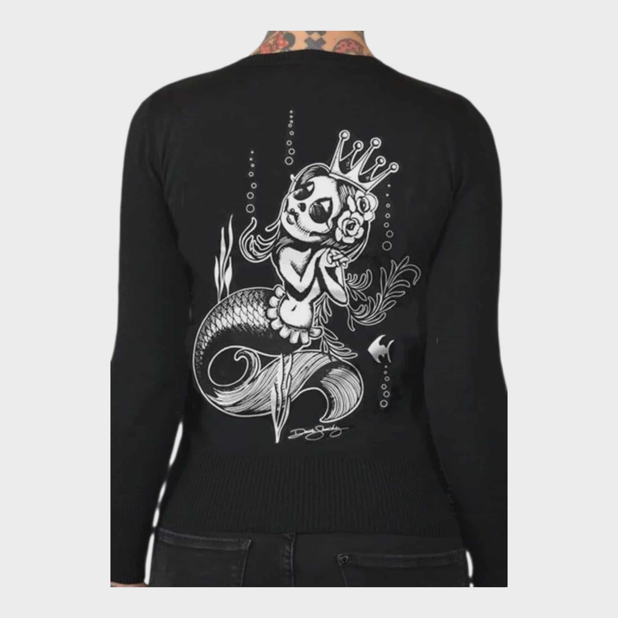 Queen of the Sea Cardigan – Pinup Mermaid Meets Day of the Dead Glam Make waves with the hauntingly beautiful cardigan, a stunning blend of rockabilly charm and spooky elegance. This black, soft-knit cardigan features a show-stopping back design by artist David Vicente — a skeletal mermaid queen crowned in underwater gothic glory. Surrounded by flowing seaweed and delicate bubbles, she’s both eerie and enchanting, embodying the perfect mix of sweet and sinister. The front is sleek and simple, offering a classic button-up silhouette that pairs effortlessly with swing skirts, high-waisted jeans, or your favorite pencil skirt.