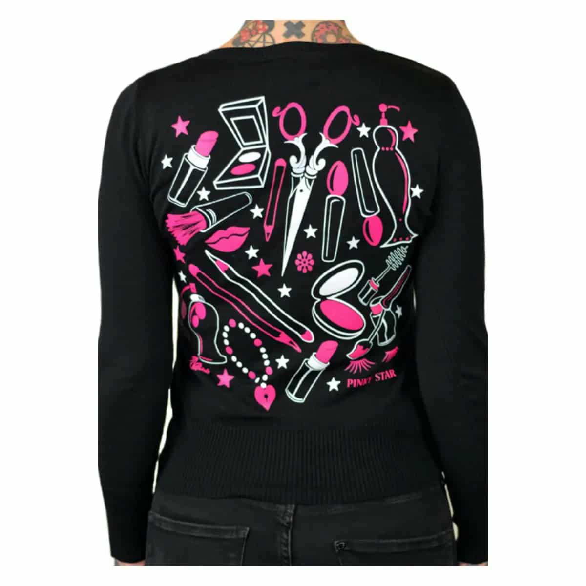 Details: Color: Black with pink and white beauty-themed artwork on the back Soft, stretchy knit for a comfortable, flattering fit Long sleeves and button-up front Ribbed cuffs and hem for a classic pinup silhouette Perfect for beauty lovers, salon queens, and rockabilly babes with a flair for fabulous