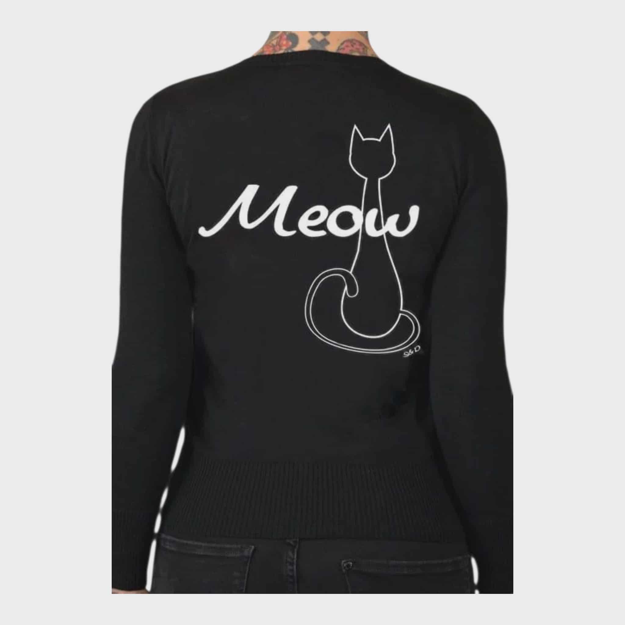 Details: Black knit button-up cardigan, White “Meow” script with minimalist cat outline on the back. Soft and stretchy material for a flattering fit. Ribbed hem and cuffs for vintage style structure. Perfect for pinup, retro, and cat lovers alike. For the cool cat who always lands on her feet — and looks fabulous doing it.