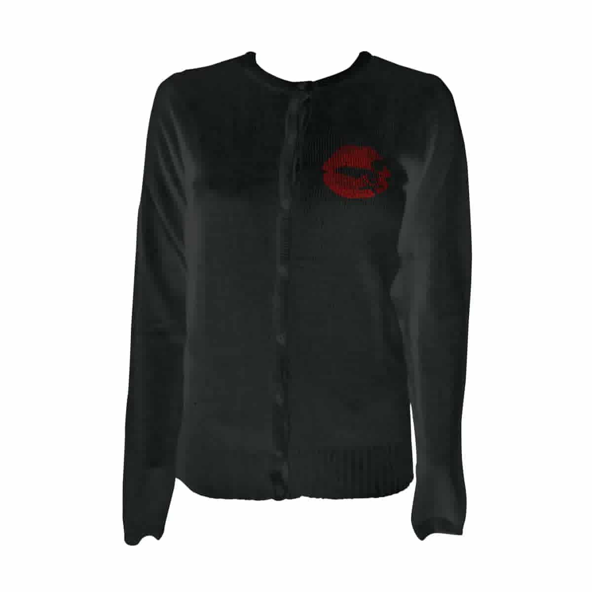 Kiss of Death Cardigan - Sultry, spooky, and perfectly pinup — the Deadly Kiss Cardigan is a bold statement piece for rockabilly babes with attitude. This fitted black cardigan features a striking red lip print across the back, complete with a hidden skull and crossbones motif that adds a dark twist to classic pinup glamour. A matching mini version of the design sits on the front chest, tying the look together with a kiss of rebellion. Crafted from soft, stretchy knit fabric, this cardigan flatters your curves while keeping you cozy. The button-up front and ribbed cuffs give it that timeless vintage shape you love. Pair it with cigarette pants, a pencil skirt, or high-waisted jeans for a killer retro look that’s equal parts sweet and sinister. Details: Color: Black with bold red lip and skull graphic on the back. Matching small lip detail on the front chest. Soft, comfortable stretch knit for a flattering fit. Button-up front with ribbed cuffs and hem Perfect for pinup, rockabilly, and gothic glam fashion lovers