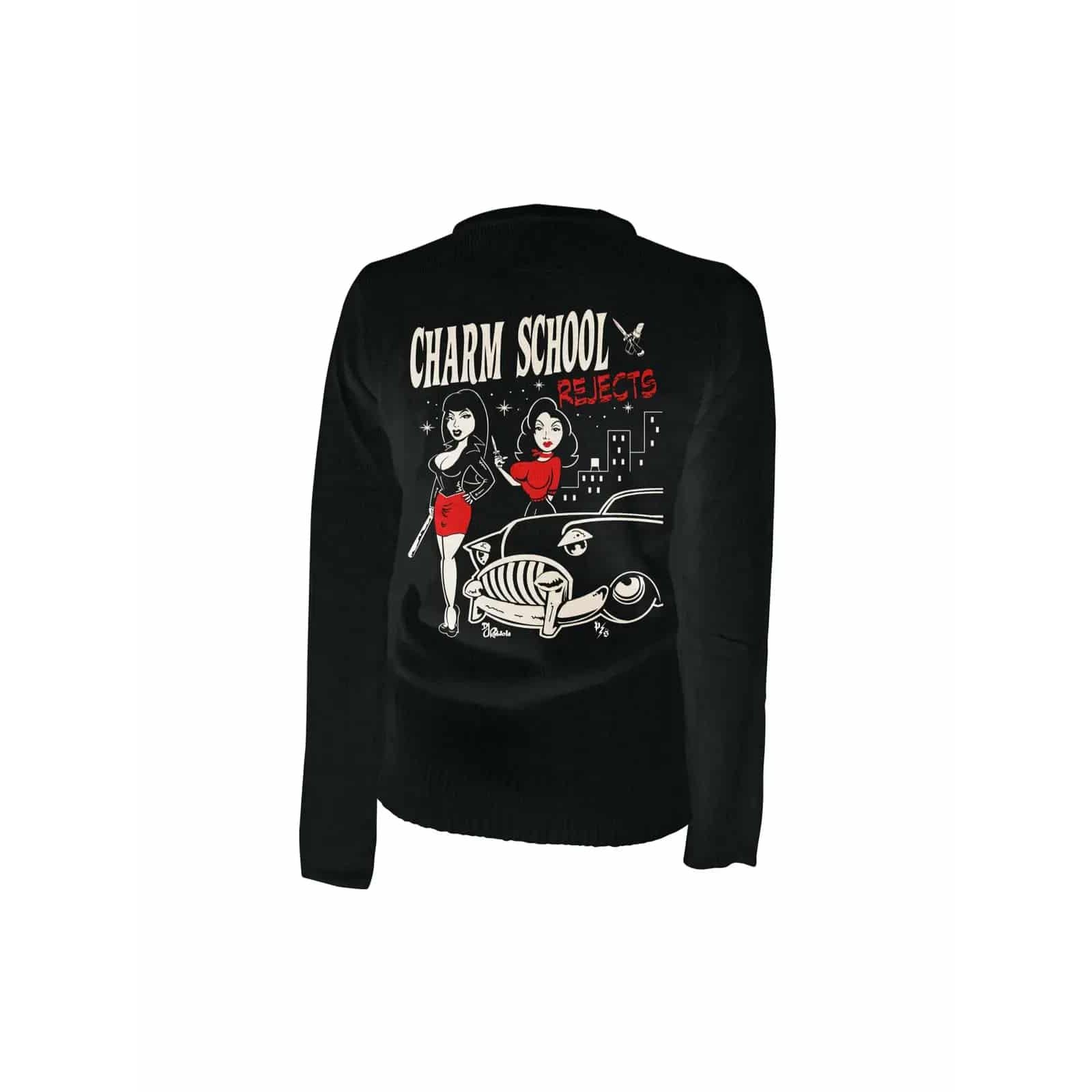 Charm School Rejects Cardigan For the bad girls who never played by the rules — the Charm School Rejects Cardigan is your new retro rebellion essential. This black cardigan features an edgy, vintage-style graphic on the back that channels classic pulp art attitude. Two fierce pinup girls stand confidently beside a slick hot rod, with the bold lettering “Charm School Rejects” splashed across the top in cream and red for a pop of daring contrast. The fitted design hugs your curves just right, while the button-up front, long sleeves, and ribbed trim keep it timelessly flattering. Crafted from a soft and stretchy knit, this piece combines comfort with rockabilly edge — perfect for styling with pencil skirts, high-waisted jeans, or your favorite swing skirt. A must-have for pinup queens, car show babes, and anyone who prefers sass over sweet. Details: Color: Black with cream, red, and white “Charm School Rejects” artwork on the back. Soft, stretchy knit for a curve-hugging fit. Long sleeves and button-up front. Ribbed cuffs and waistband for a classic pinup shape. Perfect for retro rebels and rockabilly divas who like their style with attitude