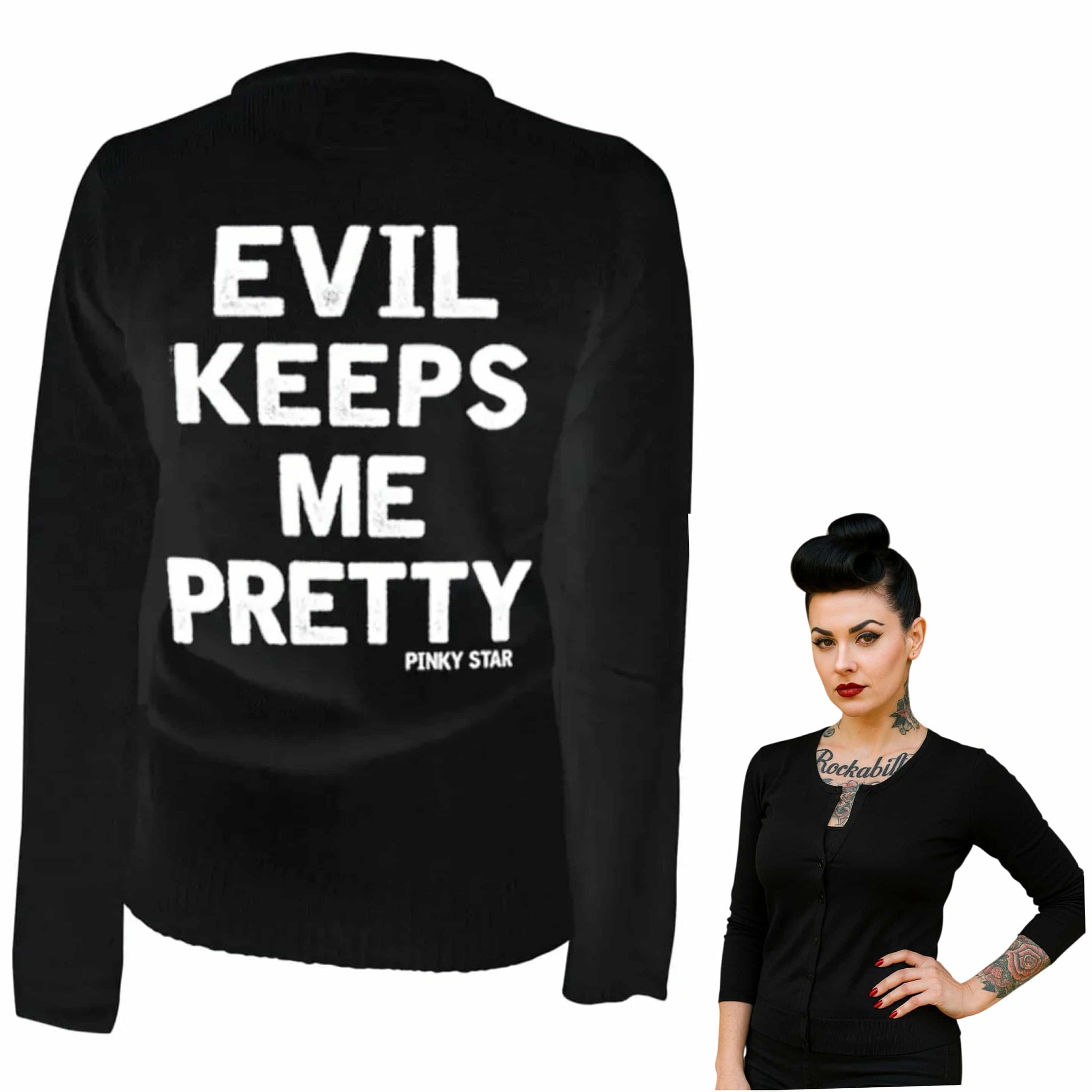 Evil Keeps Me Pretty Cardigan - Embrace your dark side in style with the Evil Keeps Me Pretty Cardigan — a wickedly fun addition to your rockabilly wardrobe. This bold black cardigan features the cheeky phrase “Evil Keeps Me Pretty” emblazoned across the back in striking white block letters, adding a sassy dose of attitude to your retro look. Crafted from a soft, stretchy knit, this cardigan hugs your curves while offering all-day comfort. The front keeps it sleek and simple with a classic button-up closure, long sleeves, and ribbed trim — making it easy to pair with high-waisted jeans, capris, or a swing skirt for that perfect pinup silhouette. Equal parts naughty and nice, this cardigan is made for vintage vixens who know that a little mischief never goes out of style.