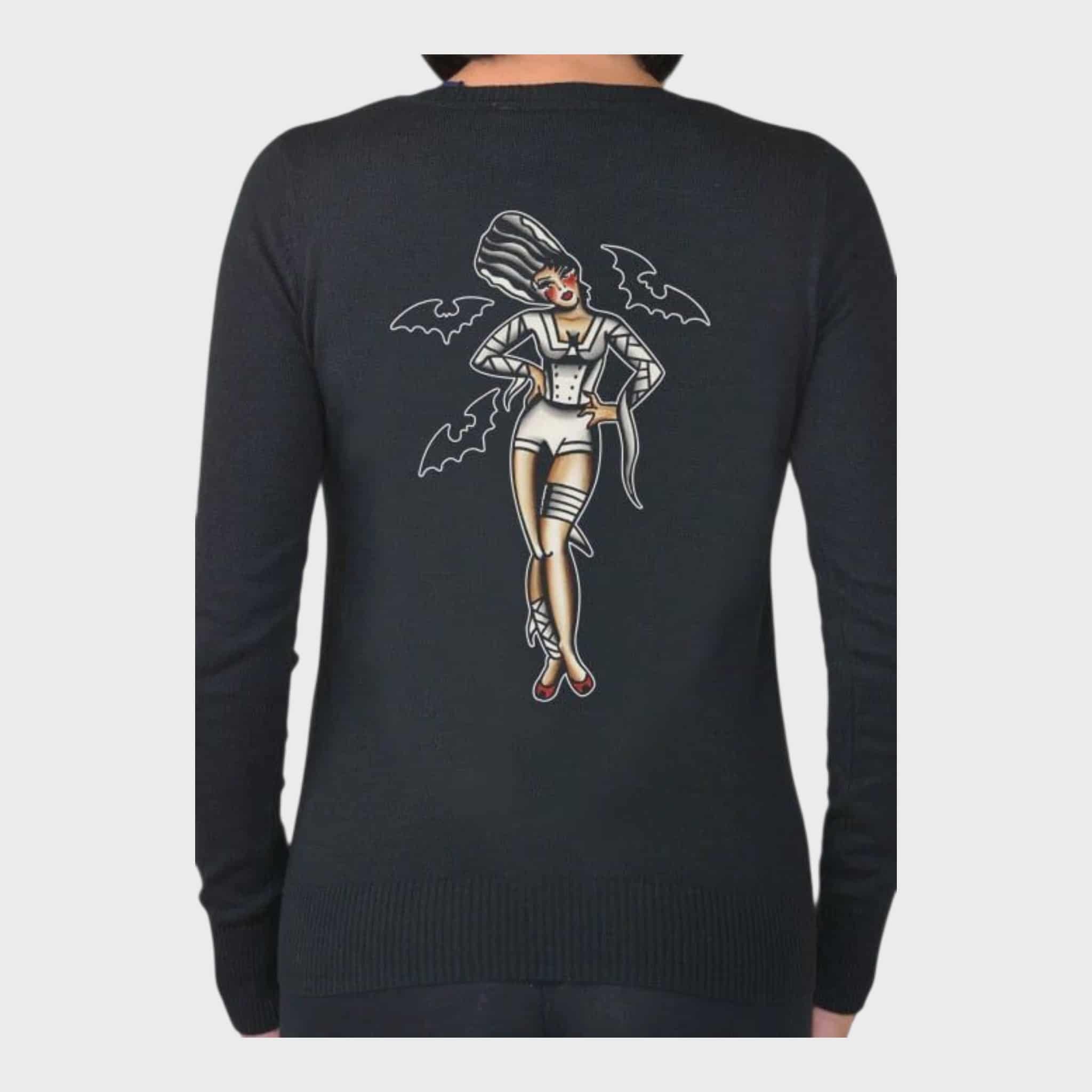 Details: Black knit button-up cardigan Bold tattoo-inspired Bride of Frankenstein pinup design on the back Soft and stretchy fit for comfort and style Long sleeves with ribbed cuffs and hem Perfect for pinup, rockabilly, and vintage horror fashion lovers A little bit creepy, a whole lot of cute — this Bride is drop-dead gorgeous.
