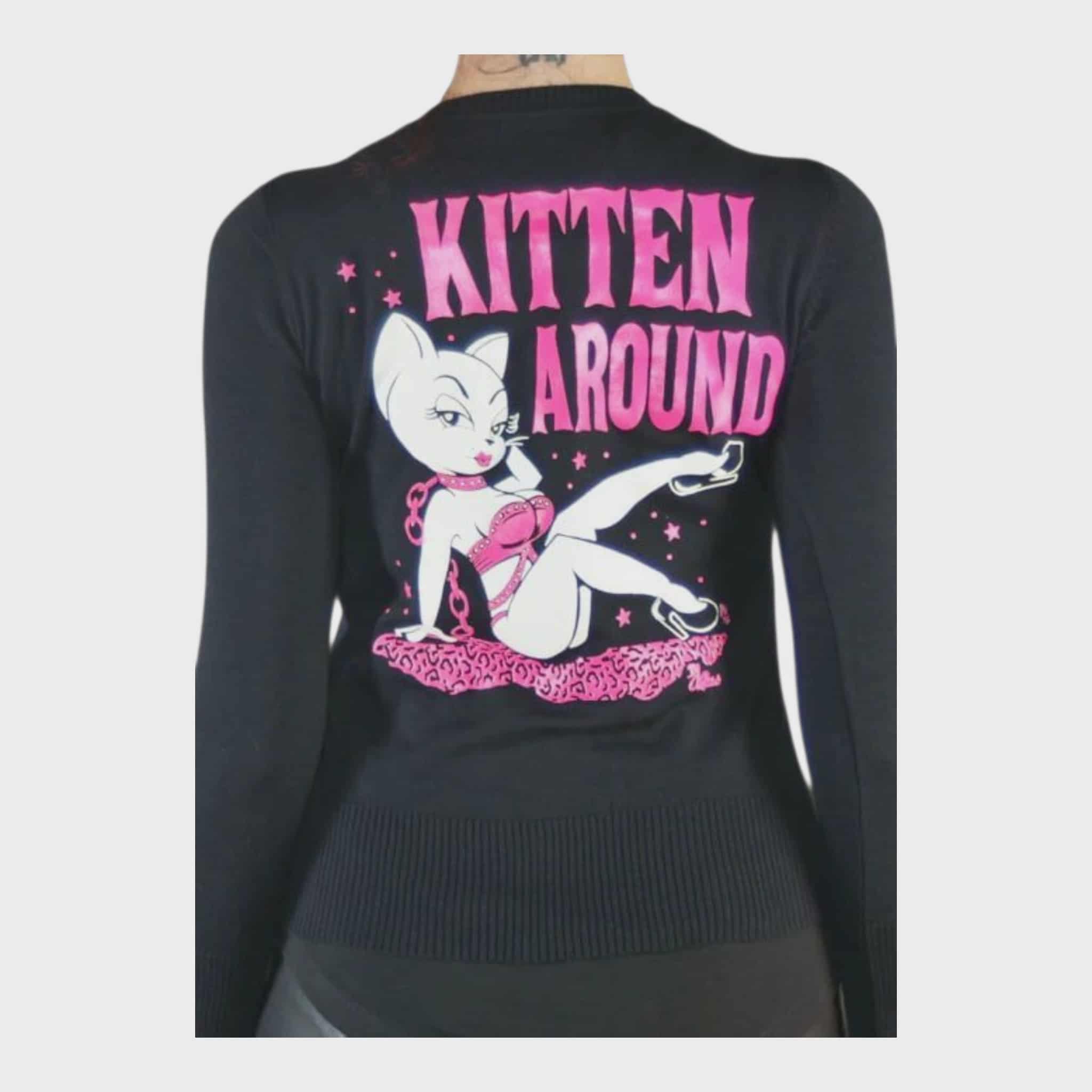 Details: Premium black stretch knit for comfort and fit. Eye-catching “Kitten Around” artwork in vibrant pink and white. Classic button-up front with long sleeves. Ribbed hem and cuffs for structure. Designed for vintage, rockabilly, and retro lovers