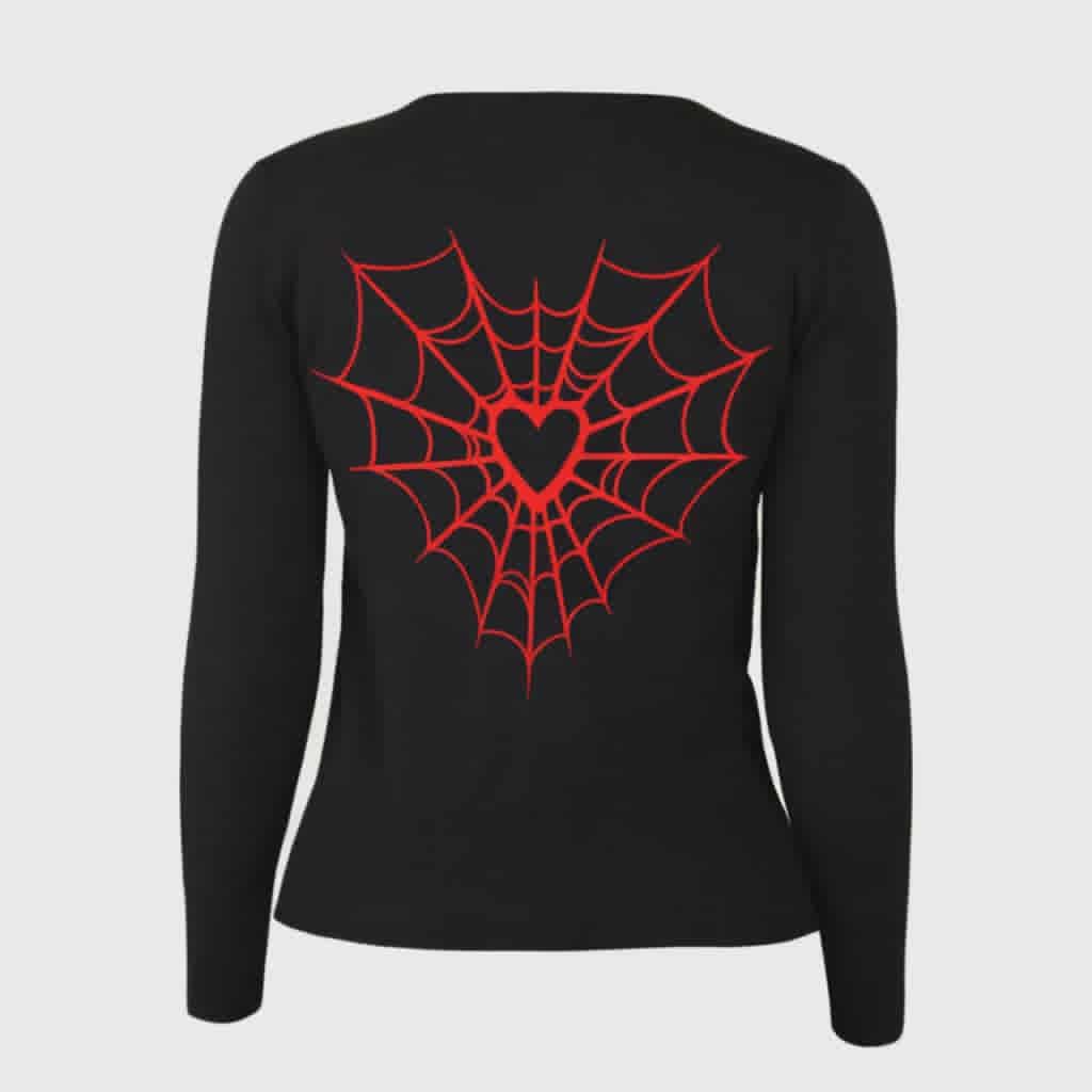 Rockabilly Heart Web Cardigan Add a touch of spooky-sweet style to your pinup wardrobe with this Rockabilly Heart Web Cardigan. This timeless black knit cardigan features a bold red spiderweb heart design on both the front and back — a perfect blend of retro romance and rebellious edge. The fitted silhouette flatters your curves, while the classic crew neckline and button-down front give it that vintage charm every pinup loves. Crafted for comfort and attitude, it pairs effortlessly with high-waisted jeans, pencil skirts, or your favorite swing skirts for a look that’s equal parts sassy and sophisticated. Whether you’re headed to a rockabilly show, a retro car meet, or just showing off your darkly darling style, this cardigan is your go-to for all things glamorous and gothic. Details: Color: Black with red embroidered spiderweb heart designs. Soft, stretchy knit for a perfect fit Button-front closure Long sleeves and ribbed hem for a classic vintage shape Ideal for retro, pinup, and rockabilly fashion lovers