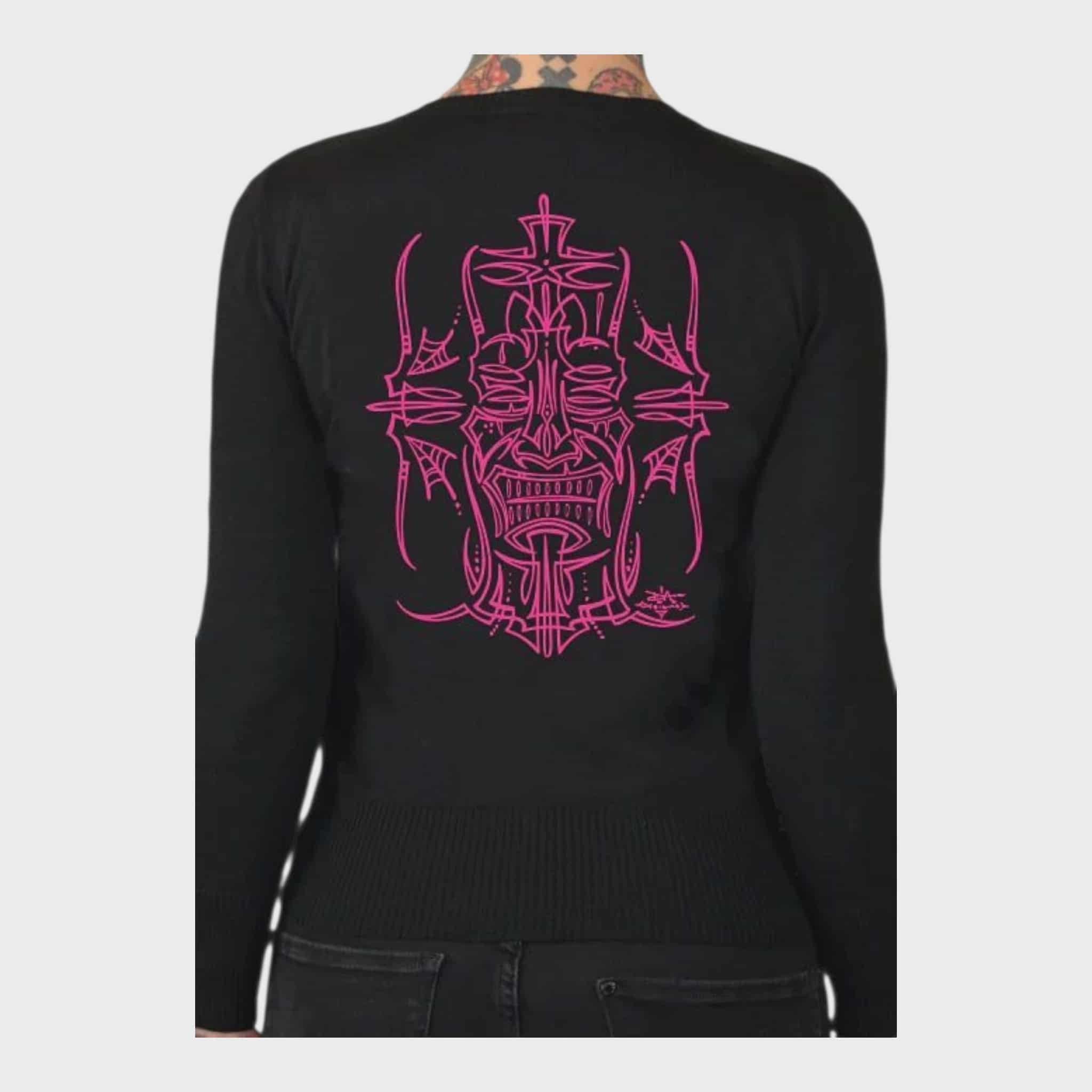Details: Soft, fitted black knit with a vintage-inspired cut. Neon pink pinstriped tiki artwork on the back. Classic button-up front with ribbed cuffs and hem. Comfortable stretch with a rockabilly edge. Perfect for tiki lovers, hot rod queens, and retro rebels. For the pinup who lives loud, loves bold, and brings the tiki party wherever she goes.