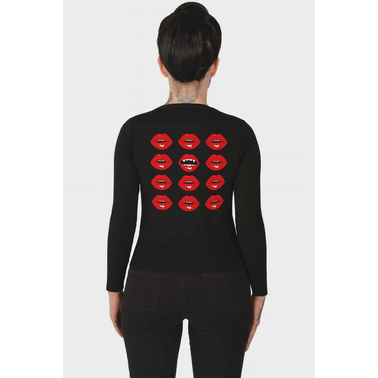 Details: Soft, fitted black knit with a vintage-inspired cut Red vampire lip graphics on front and back Classic button-up front and long sleeves Ribbed cuffs and waistband for structure Perfect for horror pinups, spooky babes, and retro rebels